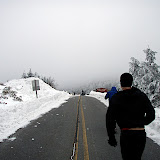 There was a strict cutoff for the Challenge once runners got to the Parkway. Make it before 10am, and you can motor on to the summit. 10:01, and you turn around (but can still complete the Marathon as an official finisher). I cruised thru at 9:22, feeling strong and rather positive. Onward and upward! I took a moment to refresh at the aid station (all of them were lavishly stocked! I took a liking to the animal crackers today), take off the Yak Trax (we would now be on a plowed road), and put on some more clothes. Once we rounded a turn, the winds coming thru the gap stopped me in my tracks. Seriously. So strong I could barely move. Luckily this would be the worst of it, but I hung around a group of others as we slowly climbed up to 6,684'. Clouds hung low, so we saw no spanning vistas; instead, we were transported to a crazy land where the trees were not only covered with snow, but reminded me of those fake white christmas trees you see. Surreal! I snapped a few pics, but the temps kept my fingers tucked inside warm mittens. Finally, a few hundred feet from the summit, we escaped the pavement and hit some trail. The early runners probably had it easiest - walking on top of a frozen crust of snow & ice. But by now it had been stirred up and I had to negotiate thru a mess that was nearly up to my knees. Once we tagged the sign at the summit, we were signed off and now officially half way done! It was all downhill from here. Literally. How hard could that be? (well, Black Mountain does sit around 2,300'....)