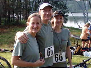Norma, Ken & I before the startWe got our transition area set up with gear organized for quick ins & outs. Then we dropped our packs off at a truck (our intructions said we'd retrieve them at CP1) and headed to the start line. We snagged a position near the front and at the sound of the gun (ok, it was really just Chris or Zach's voice), we were off! We beelined for the lakeshore for a short swim to the other side. A short run to CP1 followed, where we retrieved our packs from piles of hay. My bite valve had come unlocked and was dripping - I hoped not too much escaped. We then followed the powerlines through some big hills (